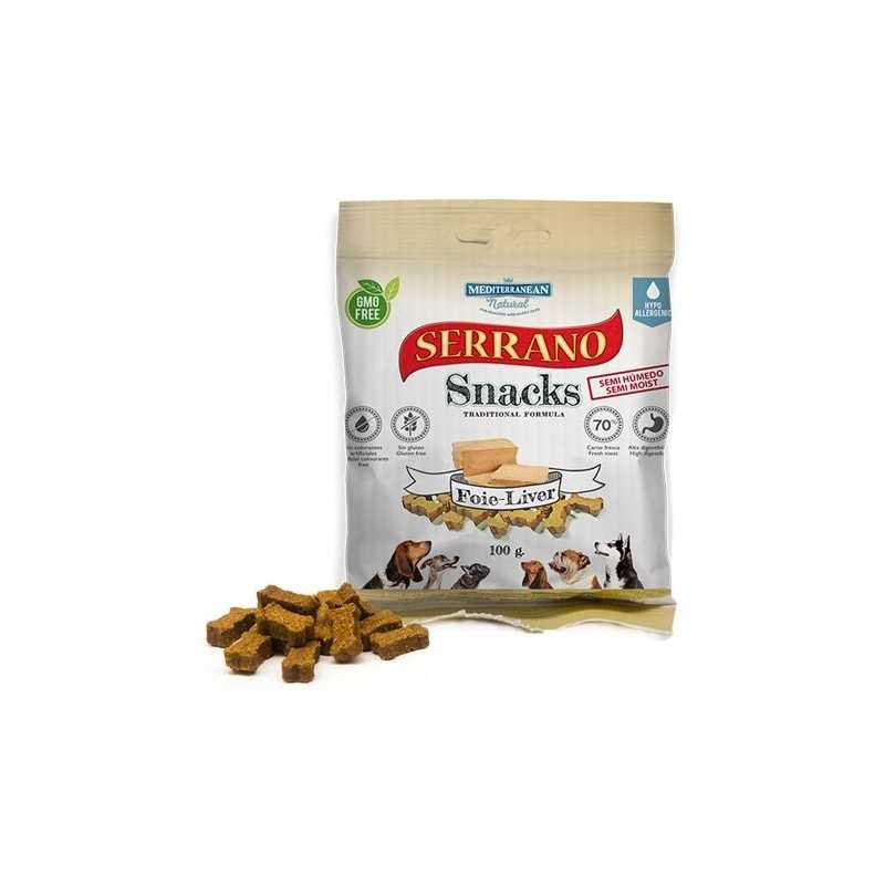 Mediterranean Natural Serrano Snacks FOIE es un complemento alimenticio en forma de huesitos, especialmente formulado para perros de cualquier raza y tamaño, cuyos componentes naturales con carne fresca, están libres de gluten. Disponible en la presentación caja de 25 unidades de 100 gramos cada uno.